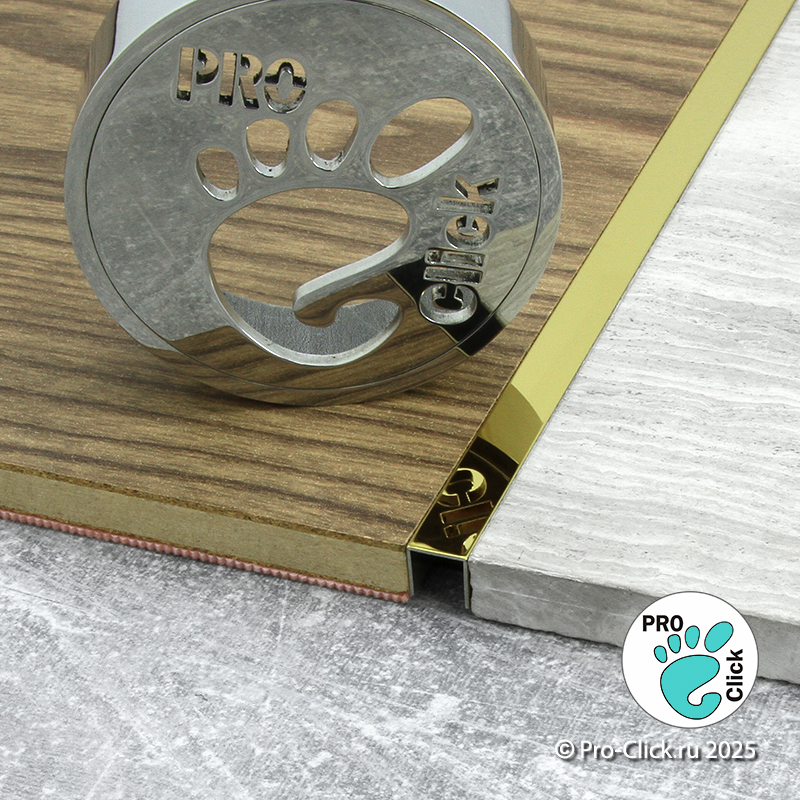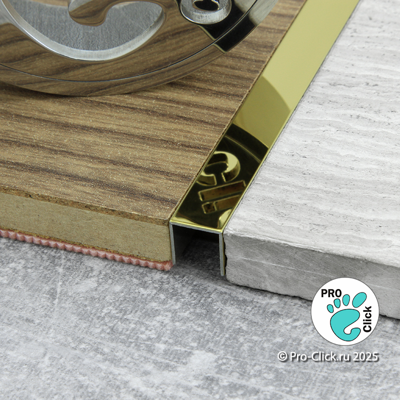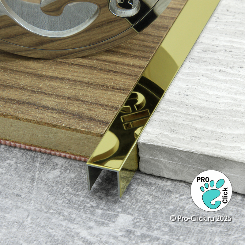 Декоративный разделитель П - образной формы для использования в качестве декора между напольными покрытиями или стеновыми панелями. Выполнен из прочной нержавеющей стали Aisi 304 которая способна находиться в постоянном контакте с водой и даже в погруженном состоянии под воду. Поверхность профиля отполированная до безупречного зеркала и покрытия декоративным слоем нитрид титана золотого цвета. Данное покрытие очень устойчиво к царапинам, именно по этому данную технологию используют на дверных ручках или металлической посуде и иных предметах которые подвергаться постоянному контакту, прикосновению или трению. Поверхность золотого цвета невозможно отличить от полированной латуни, но преимущество профиля из нержавейки в более низкой цене, нержавейка не темнее с годами, то есть не требует ухода как изделия из латуни.
